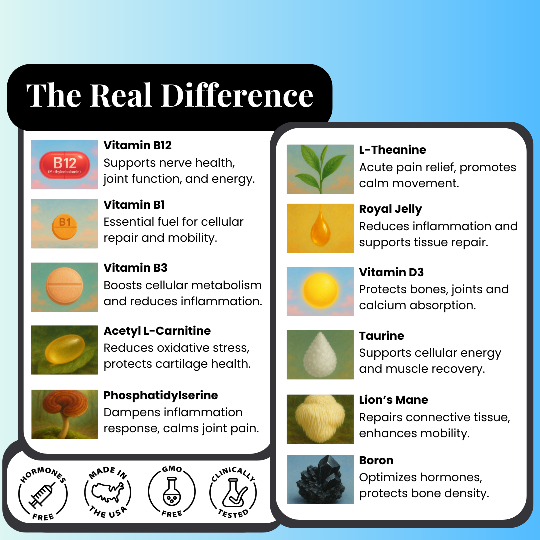 Our formula addresses the 3 key breakdowns of menopause joint pain: Bone Density Loss, Muscle Breakdown, and Chronic Inflammation, using highly bioavailable forms that restore mobility. Methylated B vitamins, therapeutic doses, hormone-free.