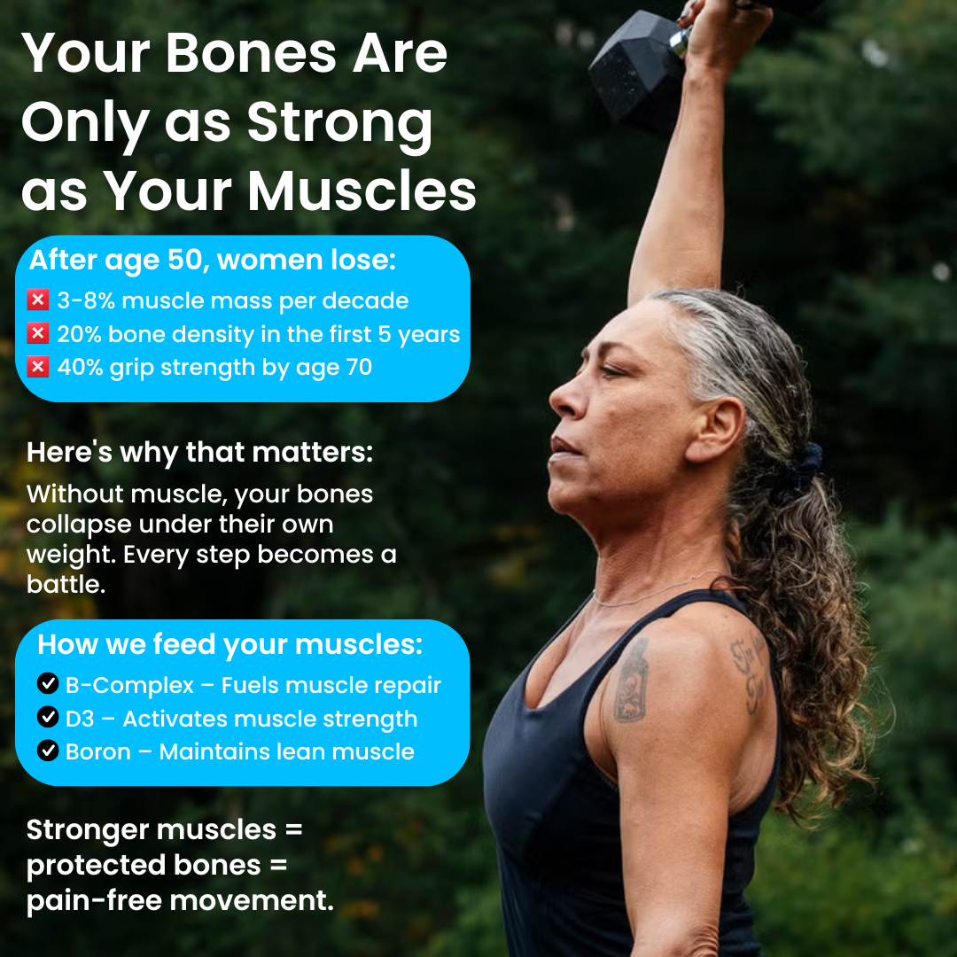Get Your Strength Back. No more weak, wobbly joints or struggling to open jars. It uses B-vitamins to fuel muscle repair and regrow the muscle tissue menopause steals—giving your joints the support they desperately need.